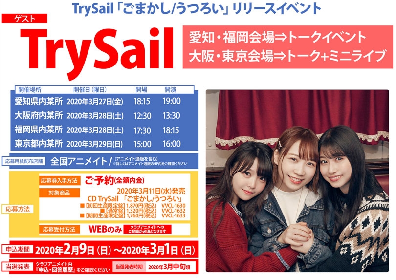 後日、そのご応募の皆様対象に抽選を実施し、当落をご案内させていただきます。延期後の開催日程などの詳細につきましては、後日、下記サイトにて改めてご案内をさせて頂きます。なお、本件に関して、アニメイト、ならびに、ソニーミュージック、SACRA MUSIC、ミュージックレイン、TrySail Portal Squareではお答えしかねる場合がございます。引き続きTrySail Portal Square、ならびにTrySail公式ツイッターでのご案内を逐次ご覧いただきますようお願い申し上げます。楽しみにされていたお客様へ多大なご迷惑をおかけ致しますことを、心より深くお詫び申し上げます。